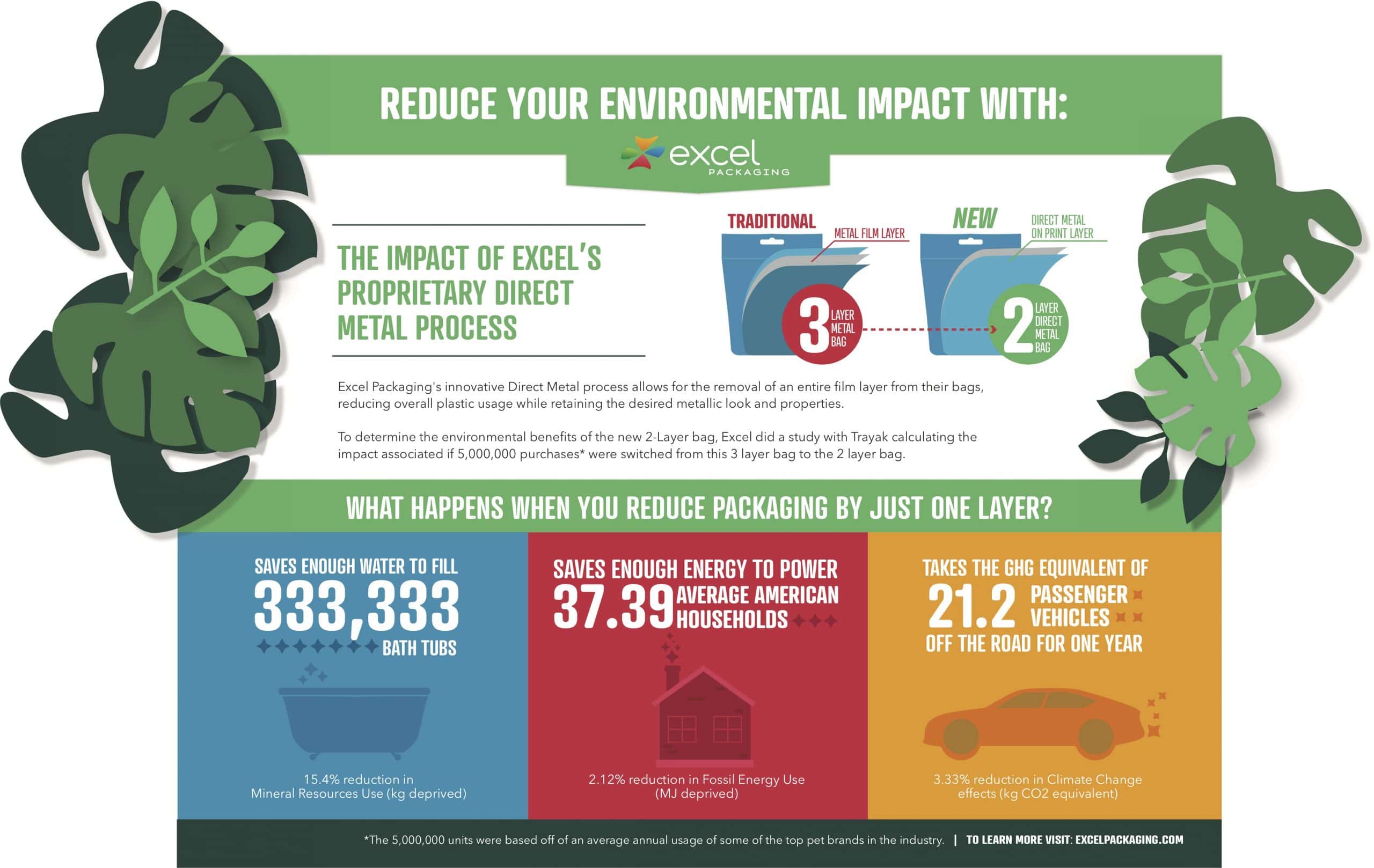 Excel Packaging worked through their PSC membership to analyze the environmental impact of its innovative Direct Metal process that allows for the removal of an entire film layer from their bags. To determine the environmental benefits of the new 2-Layer bag, Excel did a study with PSC Partner Eco-Impact Tool to calculate the impact if 5,000,000 purchases* were switched from this 3 layer bag to the 2 layer bag. This service reduces  overall plastic usage while retaining the desired metallic look and properties.